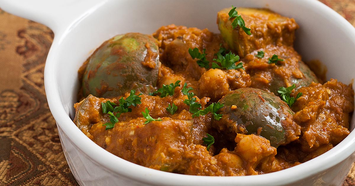 Cooked eggplants with potatoes in curry sauce with sweet basil.